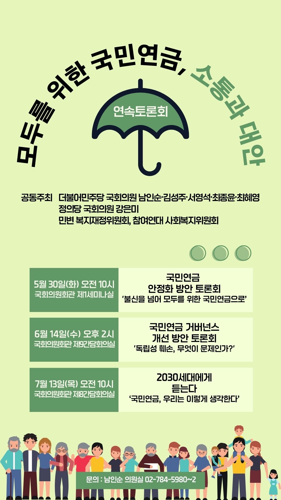 2023년 07월 13일 (목) 10:00 0530_남인순_세로B_모두를위한국민연금(전체).jpg 2030세대에게 듣는다 : '국민연금, 우리는 이렇게 생각한다' 장소의원회관 제8간담회의실(211호) 주최남인순, 김성주, 서영석... 의원실, 민변 복지재정위원회, 참여연대 사회복지위원회 문의(02) 6788-6381